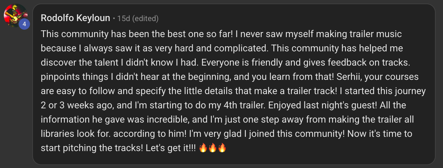 90+ composers sharing feedback, celebrating placements, meeting industry pros, and building their sync business together. Come join the room.